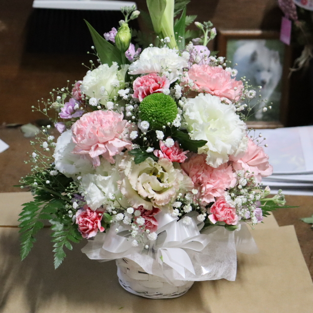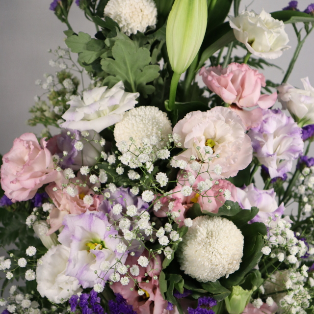 供花としての“きちんと感”と、飾りやすさを両立した標準サイズです。 祭壇まわりやお部屋の主役として場が整い、節目の贈り花にもふさわしい上品な仕立てでお届けします。