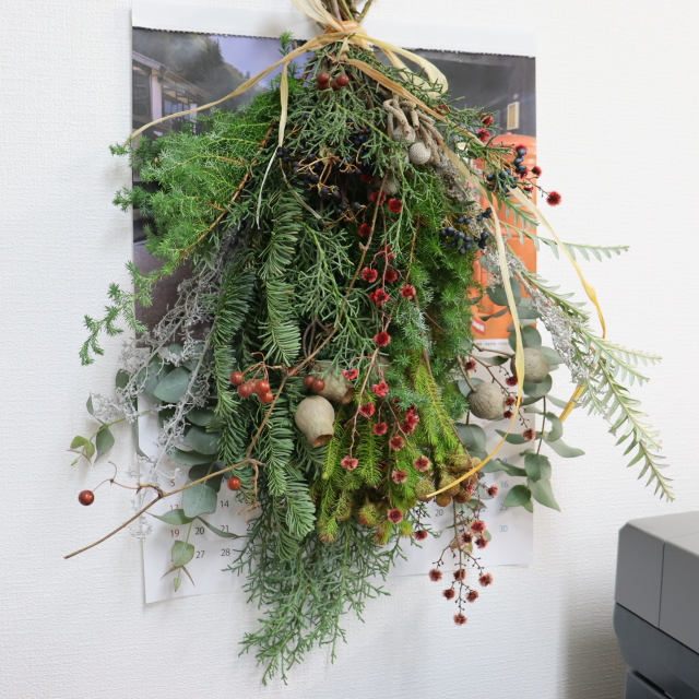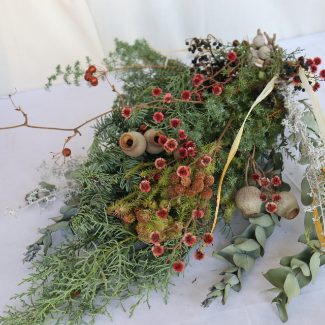 ヒムロスギやブルーアイスを使った針葉樹のスワッグです。